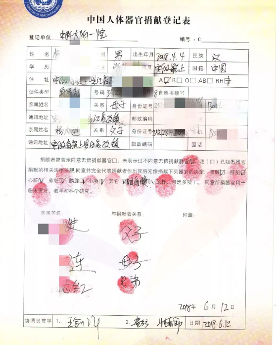 家属签署《中国人体器官捐献登记表》